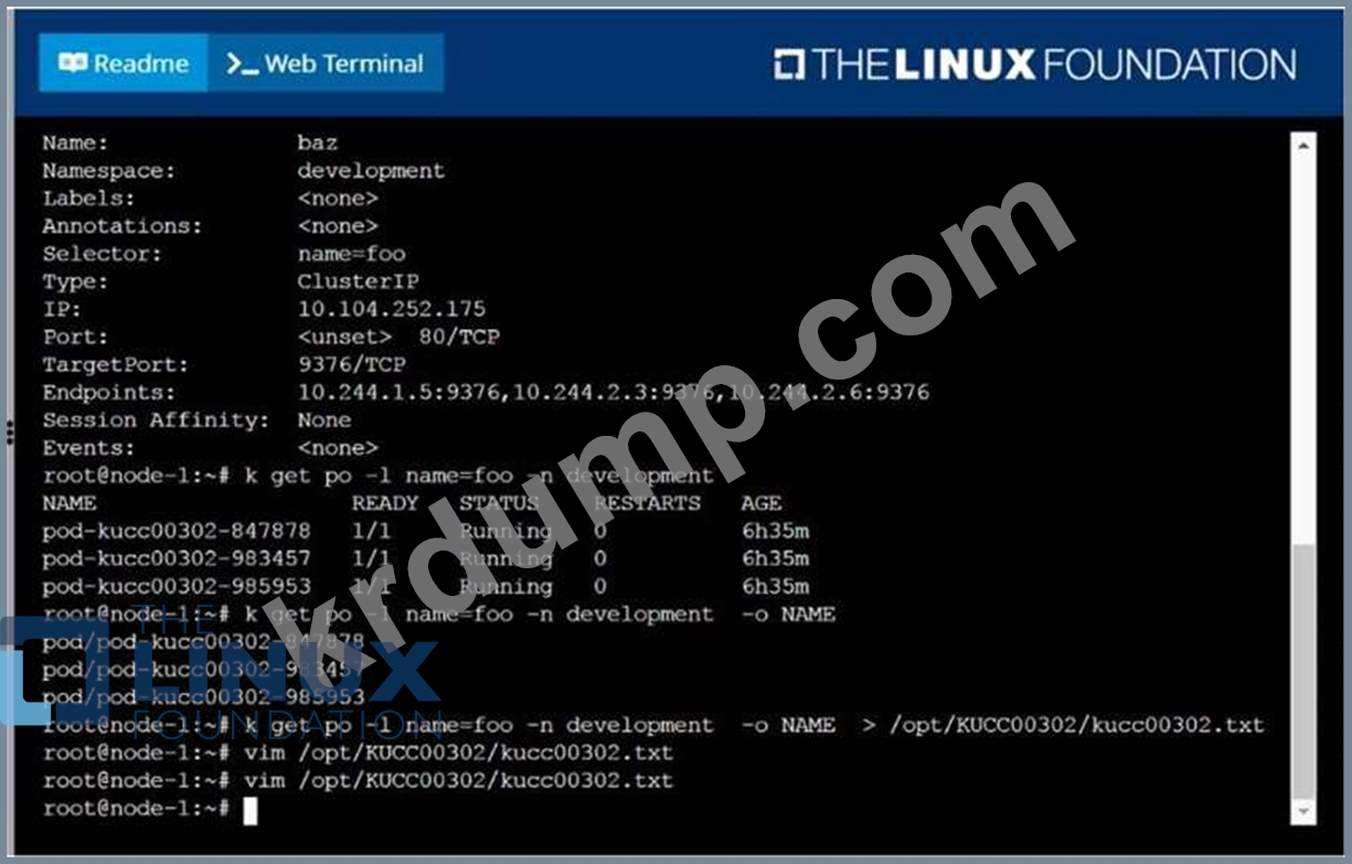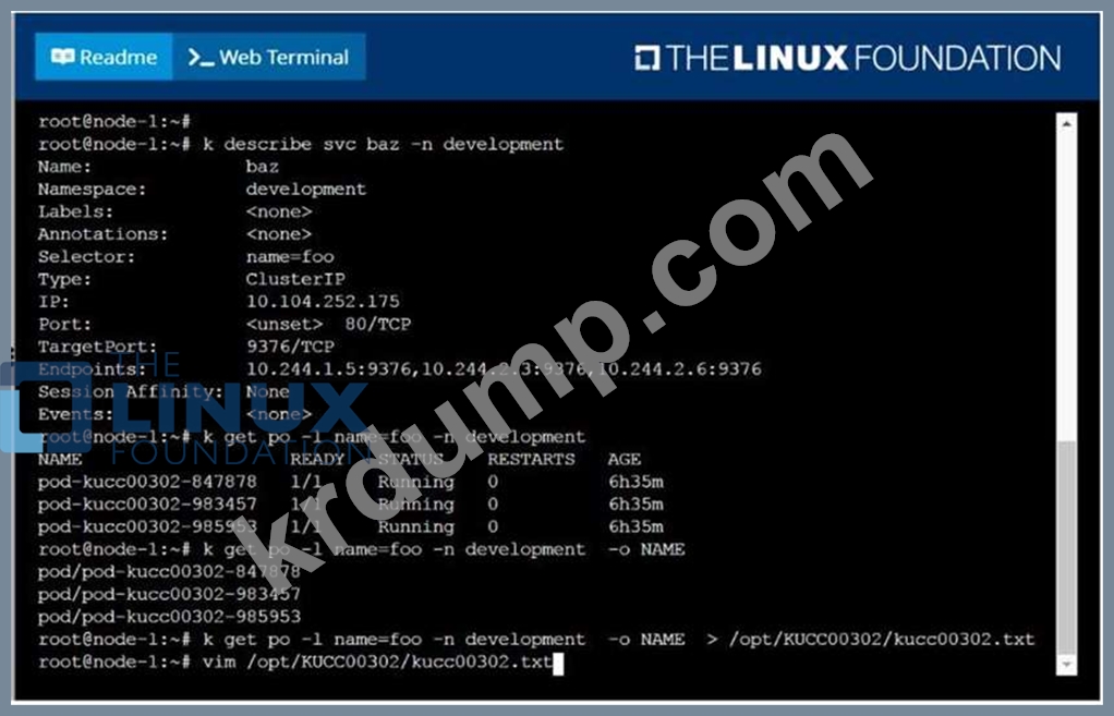 /opt/KUCC00302/kucc00302.txt는 네임스페이스 개발에서 서비스 baz를 구현하는 모든 포드를 나열합니다.