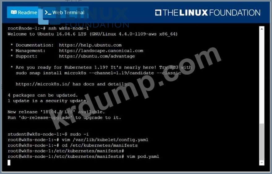 name=wk8s-node-1로 레이블이 지정된 노드에서 kubelet systemd-managed 서비스를 구성하여 webtool이라는 Image httpd의 단일 컨테이너를 포함하는 포드를 자동으로 시작합니다. 필요한 모든 사양 파일은 노드의 /etc/kubernetes/manifests 디렉토리에 있어야 합니다.