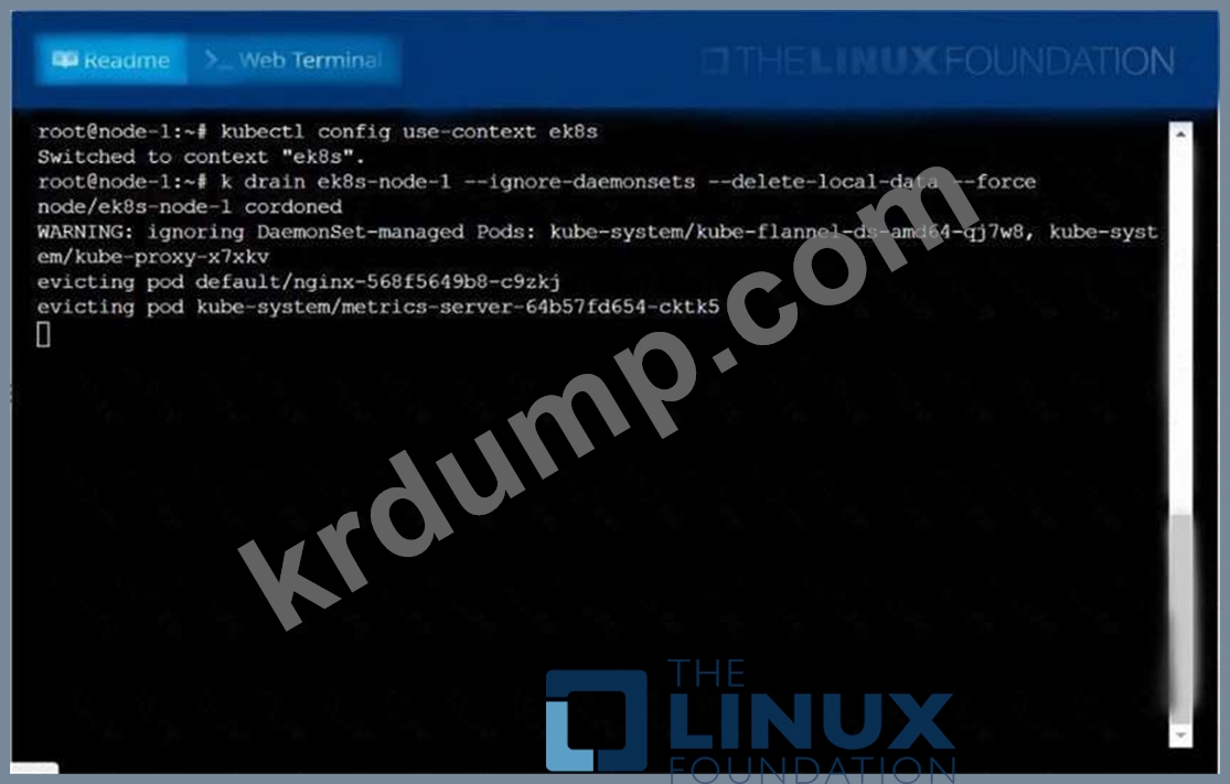 ek8s-node-1이라는 노드를 사용 불가능으로 설정하고 노드에서 실행 중인 모든 포드를 다시 예약합니다.