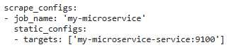 - 'prometheus.yaml' 파일의 'scrape_configs'에 엔드포인트를 추가하여 마이크로서비스에서 메트릭을 스크래핑하도록 Prometheus를 구성합니다.