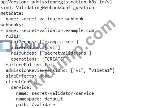 2. 유효성 검사 웹훅 구성을 만듭니다. - ValidatingWebhookConfiguration 리소스를 만듭니다. - 'SecretValidatoo CRD와 일치하도록 '규칙'을 정의하고 CRD의 모든 작업에 대해 웹훅이 트리거되는지 확인합니다. - 유효성 검사에 실패할 경우 포드 배포를 방지하려면 'failurePolicy'를 'Fail'로 지정합니다. - 지원되는 API 버전을 나타내려면 'admissionReviewVersions'를 제공합니다. - 웹훅은 유효성 검사만 수행하고 객체를 수정하지 않으므로 'sideEffects'를 '없음'으로 설정합니다.