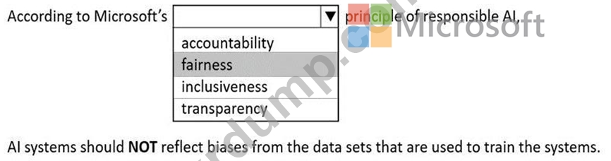 In this scenario, the statement emphasizes that AI systems should NOT reflect biases from the datasets used to train them, which directly aligns with the fairness principle. Bias in AI models can arise when the data used for training is unbalanced or not representative of the real-world population. For instance, if a facial recognition model is trained mostly on images of one demographic group, it may perform poorly on others- an example of unfair bias. Microsoft advocates building and testing AI systems with diverse, high-quality datasets to ensure fair performance across all groups.