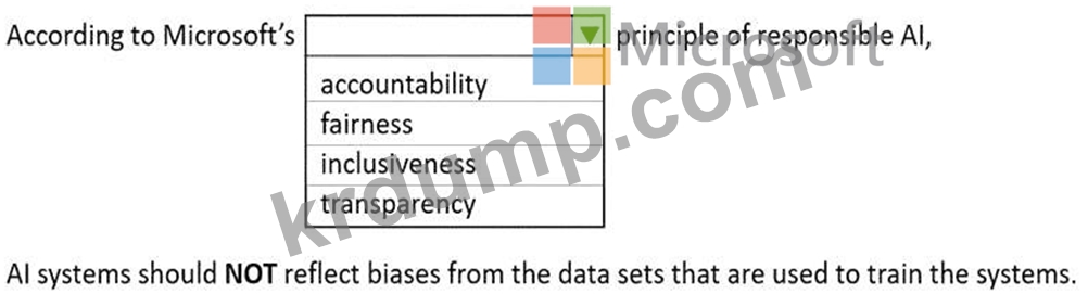 Therefore, based on the official AI-900 training content and Microsoft's Responsible AI framework (which includes fairness, reliability, privacy, inclusiveness, transparency, and accountability), the correct answer is C.
