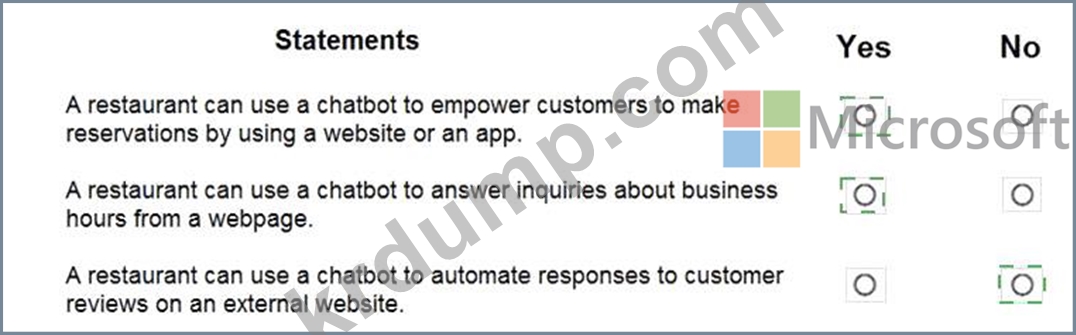 * A restaurant can use a chatbot to empower customers to make reservations using a website or an app - Yes.This statement is true because conversational AI is designed to handle structured tasks such as booking, scheduling, and information retrieval. Chatbots built with Azure Bot Service can connect to backend systems (like a reservation database) to let customers make or modify reservations through a chat interface. The AI-900 study guide explicitly notes that chatbots can help businesses "automate processes such as booking or reservations" to improve efficiency and customer experience.