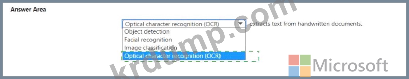 "Optical Character Recognition (OCR) extracts text from handwritten documents." According to the Microsoft Azure AI Fundamentals (AI-900) official study guide and Microsoft Learn module "Identify features of computer vision workloads," Optical Character Recognition (OCR) is a computer vision capability that enables AI systems to detect and extract printed or handwritten text from images, scanned documents, and photographs.