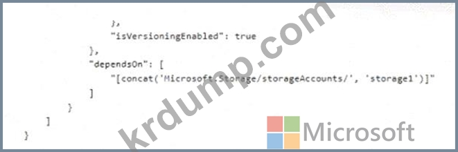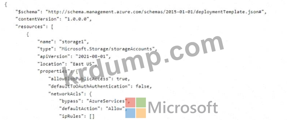 다음 Azure Resource Manager(ARM) 템플릿을 사용하여 'storage'라는 이름의 저장소 계정을 배포하려고 합니다.