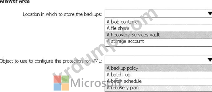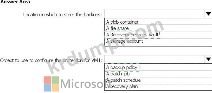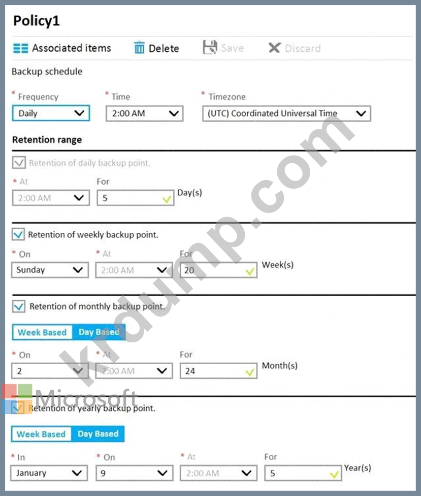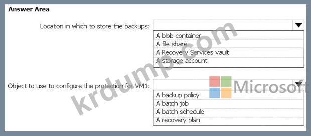 Azure Backup을 사용하여 VM1을 보호해야 합니다. 백업은 01:00에 생성되어야 하며 30일 동안 저장되어야 합니다.