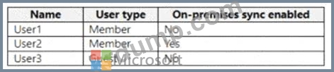다음 표에 표시된 사용자가 포함된 Azure AD의 하이브리드 배포가 있습니다.