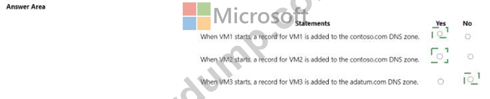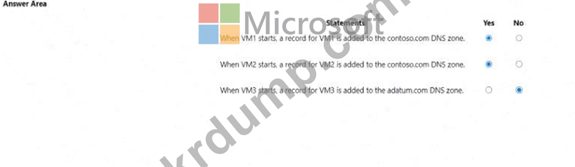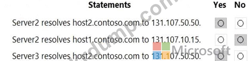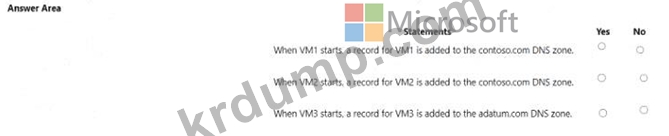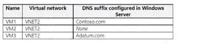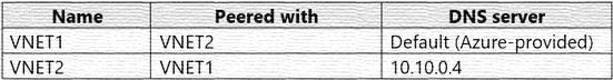 VNET2에 대한 가상 네트워크 링크가 있는 contoso.com이라는 Azure 개인 DNS 영역과 다음 표에 나와 있는 레코드가 있습니다.