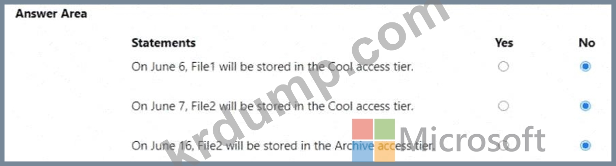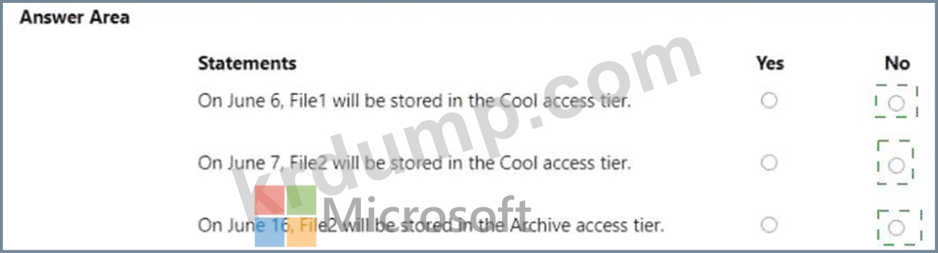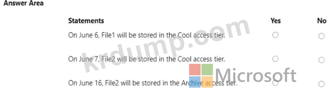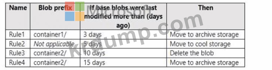 Azure 구독이 있습니다. 구독에는 다음 표에 나와 있는 수명 주기 관리 규칙이 있는 storage1이라는 스토리지 계정이 포함되어 있습니다.
