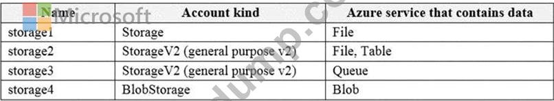 다음 표에 나와 있는 저장소 계정이 포함된 Subscription1이라는 Azure 구독이 있습니다.