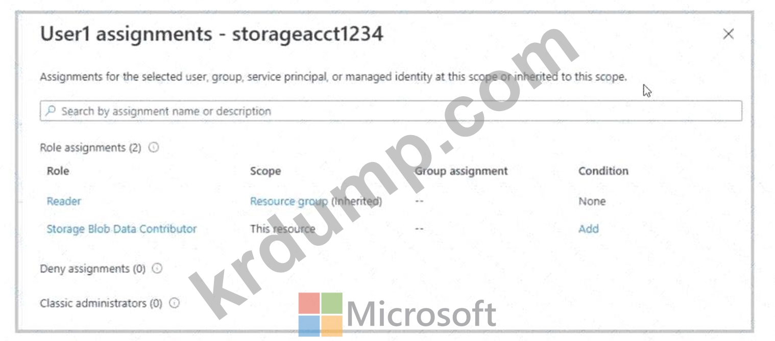 storageacct1234라는 저장소 계정과 User1, User2라는 두 사용자가 포함된 Azure 구독이 있습니다.