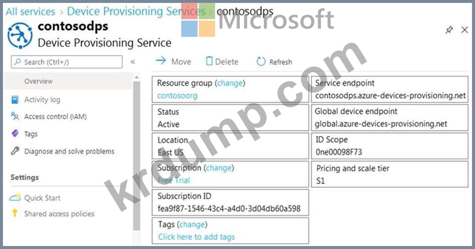 새 IoT 클라이언트 장치를 프로비저닝하려면 Device Provisioning Service의 개요 블레이드에서 어떤 두 가지 세부 정보가 필요합니까? 답변하려면 답변에서 적절한 세부 정보를 선택하십시오.