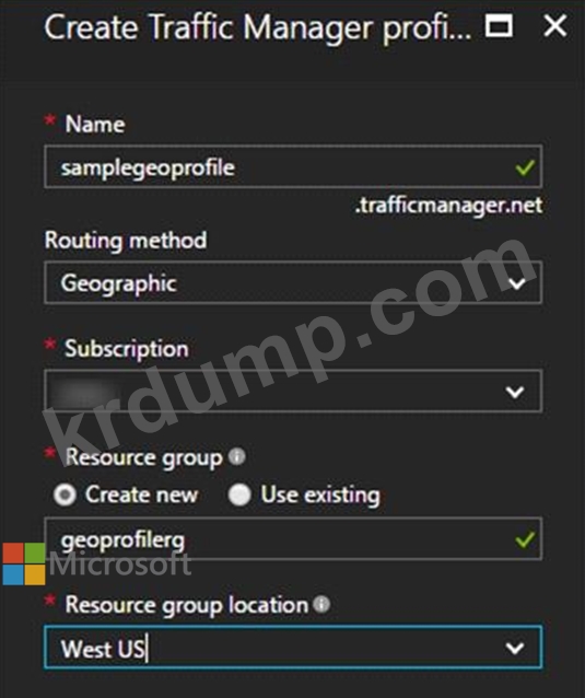 RG1lod11566895라는 리소스 그룹에 az40011566895n1-tm이라는 Azure Traffic Manager 프로필을 만들어야 합니다. 솔루션은 사용자가 항상 동일한 국가에 있는 웹사이트 사본에 연결할 수 있도록 해야 합니다.