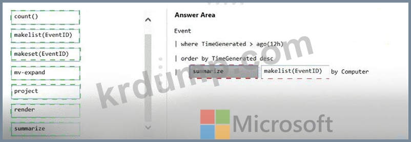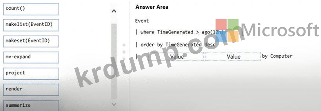 Azure Monitor 쿼리를 어떻게 완료해야 하나요? 대답하려면 적절한 값을 올바른 위치로 끕니다. 각 값은 한 번, 두 번 이상 또는 전혀 사용되지 않을 수 있습니다. 콘텐츠를 보려면 창 사이의 분할 막대를 드래그하거나 스크롤해야 할 수 있습니다.