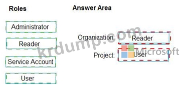 Azure 0e%Oos 조직 및 프로젝트에 필요한 역할 멤버십은 무엇인가요? 응답하려면 적절한 역할 구성원을 올바른 대상으로 끌어다 놓습니다. 각 역할 구성원은 한 번, 두 번 이상 또는 전혀 사용하지 않을 수 있습니다. 창 사이에 분할 막대를 끌거나 콘텐츠로 스크롤해야 할 수도 있습니다. 참고: 올바른 선택은 각각 1포인트의 가치가 있습니다.