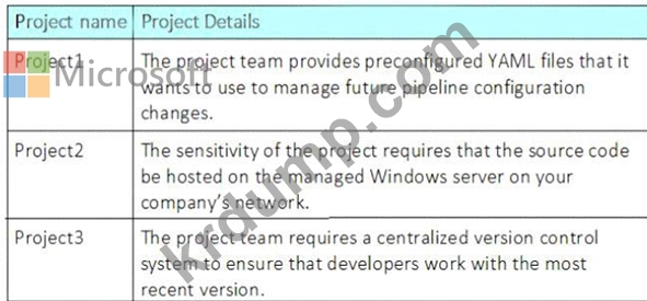 다음 표와 같이 Azure DevOps의 세 프로젝트에 대해 Azure Pipelines를 구성하고 있습니다.