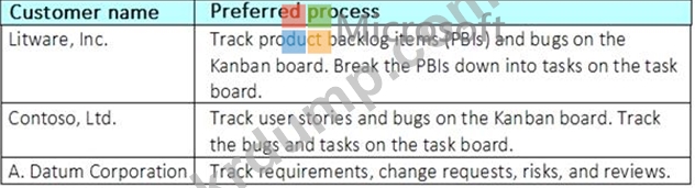 세 고객을 위한 프로젝트를 계획하고 있습니다. 작업 항목에 대한 각 고객의 선호 프로세스는 다음 표에 나와 있습니다.