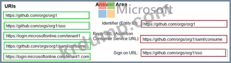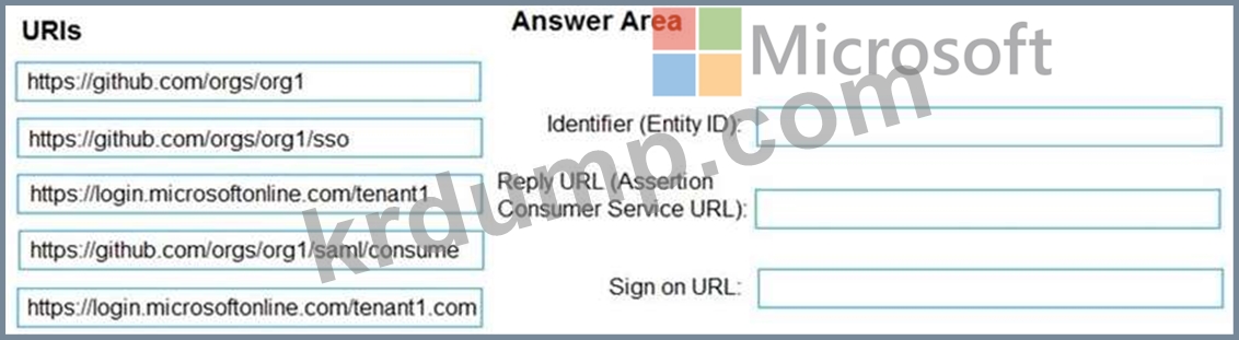 Azure AD의 SAML 구성에 어떤 URI를 사용해야 하나요? 응답하려면 적절한 URI를 올바른 설정으로 드래그하십시오. 각 URI는 한 번, 두 번 이상 또는 전혀 사용되지 않을 수 있습니다. 콘텐츠를 보려면 창 사이의 분할 막대를 드래그하거나 스크롤해야 할 수 있습니다.