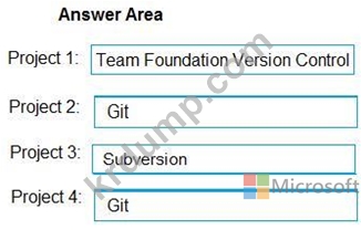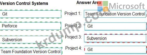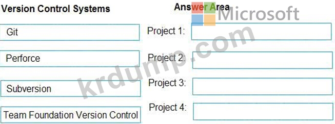 Which version control system should you use for each project? To answer, drag the appropriate version control systems to the correct projects. Each version control system may be used once, more than once, or not at all.