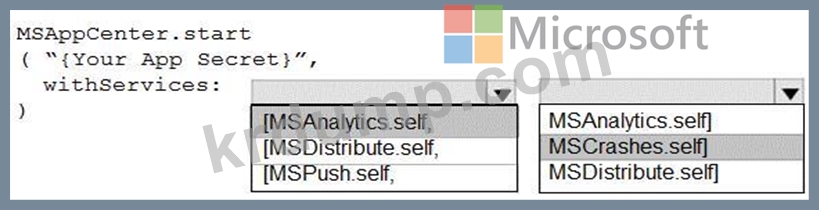모바일 애플리케이션에서 App Center를 초기화하려면 코드를 어떻게 완성해야 합니까? 응답하려면 응답 영역에서 적절한 옵션을 선택하십시오.