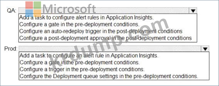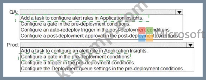 Azure DevOps에 릴리스 파이프라인이 포함된 프로젝트가 있습니다. 파이프라인에는 QA와 Prod라는 두 단계가 있습니다. QA는 webapp1이라는 Azure 웹앱에 코드를 배포하고, Prod는 webapp2라는 Azure 웹앱에 코드를 배포합니다.