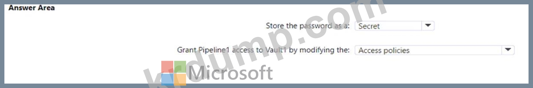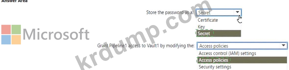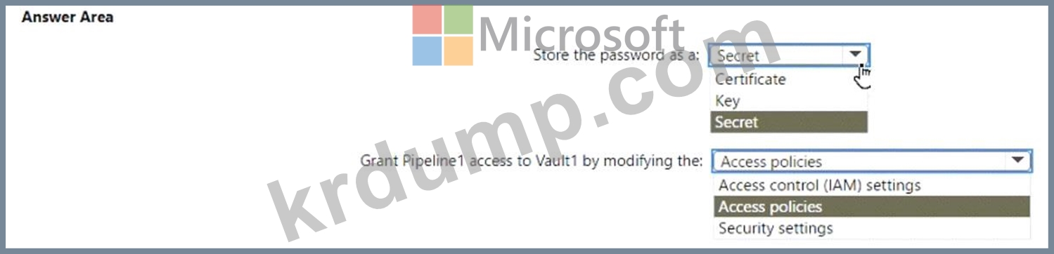 Vault1에 비밀번호를 저장해야 합니다. 솔루션은 Pipeline1에서 비밀번호에 접근할 수 있도록 해야 합니다.