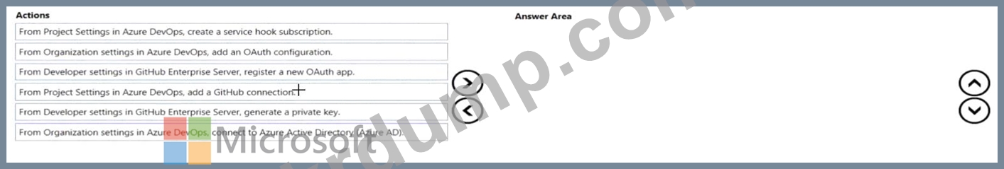 GitHub 커밋, 풀 리퀘스트, 이슈를 프로젝트 1의 작업 항목에 연결해야 합니다. 솔루션은 OAuth 기반 인증을 사용해야 합니다. 어떤 세 가지 작업을 순서대로 수행해야 할까요? 답변하려면 작업 목록에서 해당 작업을 답변 영역으로 옮기고 올바른 순서대로 정렬하세요.