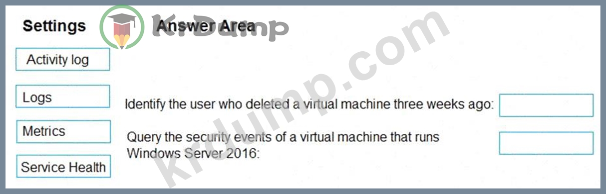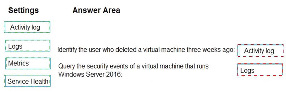 What should you use in Azure Monitor? To answer, drag the appropriate configuration settings to the correct details. Each configuration setting may be used once, more than once, or not at all. You may need to drag the split bar between panes or scroll to view content.