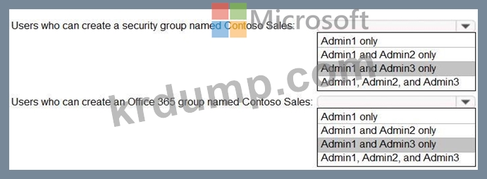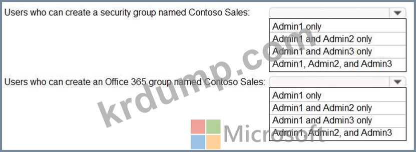 어떤 사용자가 contoso.com에서 Contoso Sales라는 그룹을 만들 수 있나요? 응답하려면 응답 영역에서 적절한 옵션을 선택하십시오.