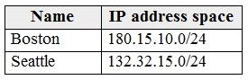 귀하의 회사는 시애틀과 뉴욕에 두 개의 사무실이 있습니다. 각 사무실은 NAT 장치를 사용하여 인터넷에 연결합니다. 사무실은 다음 표에 표시된 IP 주소를 사용합니다.
