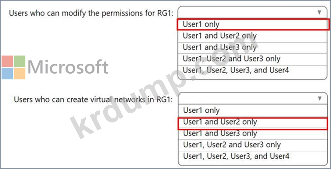 어떤 사용자가 RG1에 대한 권한을 수정할 수 있고 어떤 사용자가 RG1에서 가상 네트워크를 만들 수 있습니까? 응답하려면 응답 영역에서 적절한 옵션을 선택하십시오.