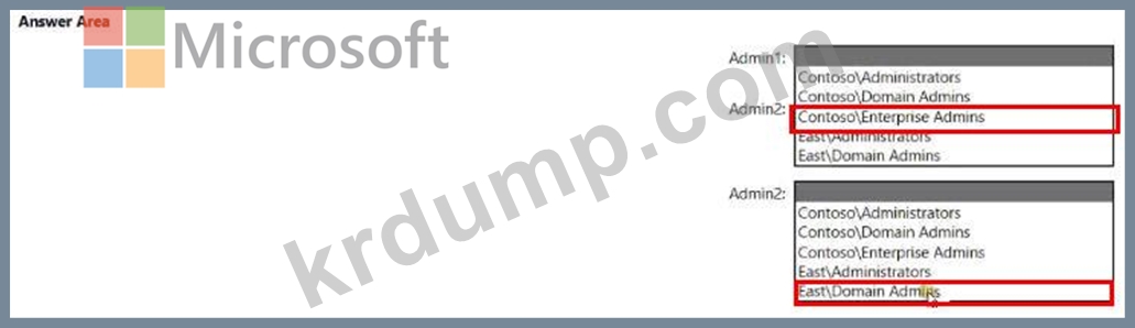 네트워크에 contoso.com이라는 AD DS(Active Directory 도메인 서비스) 포리스트가 포함되어 있습니다. 포리스트에는 east.contoso.com이라는 자식 도메인이 있습니다.