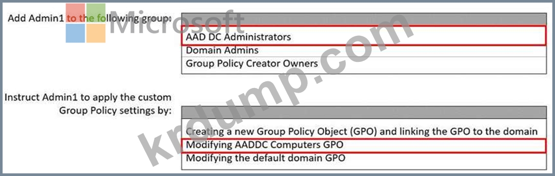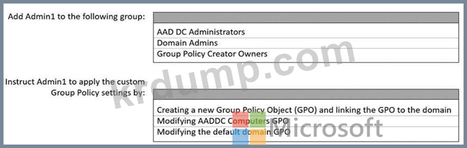도메인의 모든 컴퓨터에 사용자 지정 그룹 정책 설정을 배포하려면 Admin1이 필요합니다. 솔루션은 최소 권한 원칙을 사용해야 합니다.