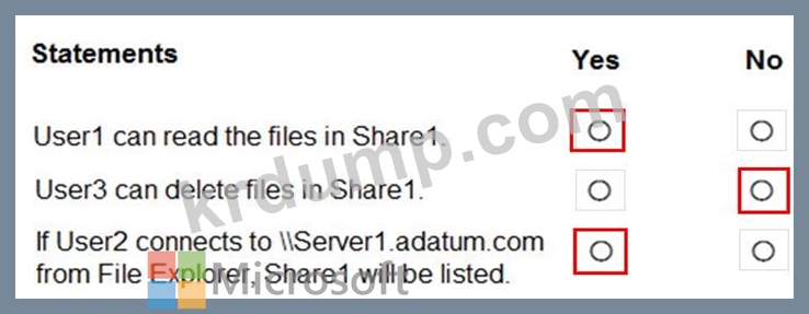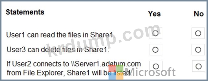 네트워크에 adatum.com이라는 AD DS(Active Directory 도메인 서비스) 도메인이 있습니다. 도메인에는 Server1이라는 서버와 다음 표에 표시된 사용자가 포함됩니다.