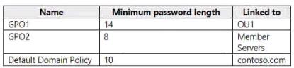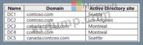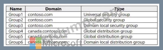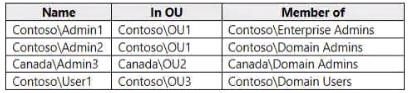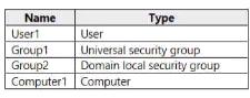 네트워크에 contoso.com이라는 온-프레미스 AD DS(Active Directory 도메인 서비스) 도메인이 포함되어 있습니다. 도메인에는 다음 표에 표시된 개체가 포함되어 있습니다.