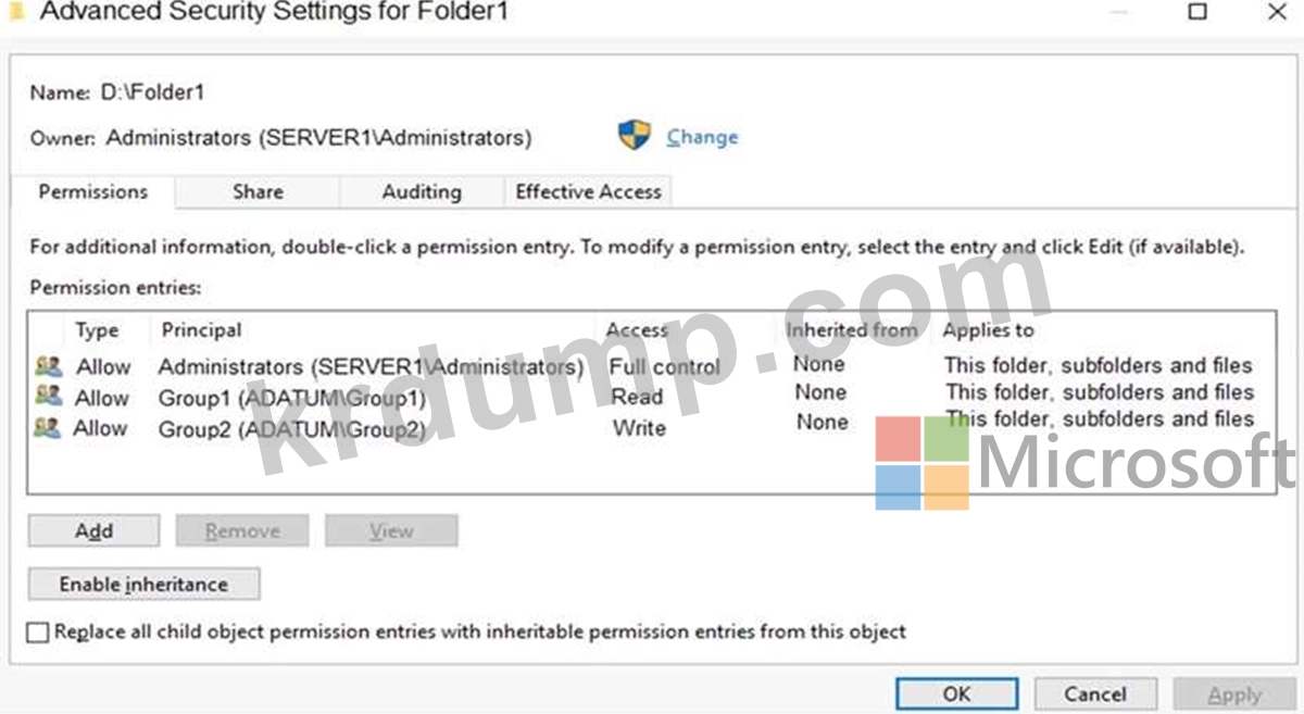 Server1에는 D:\Folder1이라는 폴더가 있습니다. Folder1에 대한 고급 보안 설정은 권한 전시에 표시된 대로 구성됩니다. (권한 탭을 클릭합니다.)