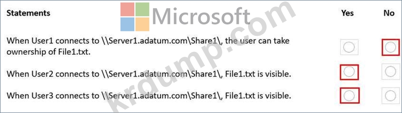 네트워크에 adatum.com이라는 AD DS(Active Directory 도메인 서비스) 도메인이 있습니다. 도메인에는 Server1이라는 파일 서버와 User1, User2, User3이라는 세 명의 사용자가 있습니다.