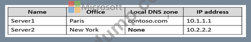 뉴욕 사무실의 모든 클라이언트 컴퓨터는 Server2를 DNS 서버로 사용합니다.