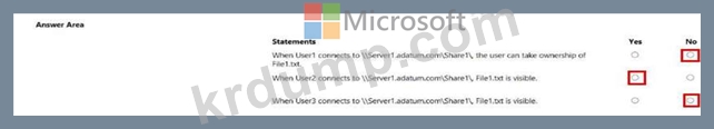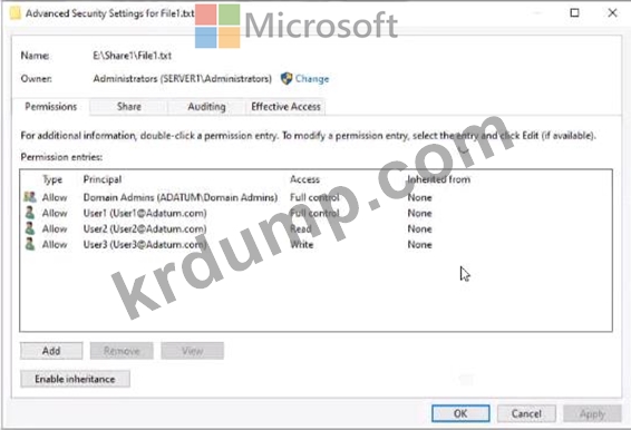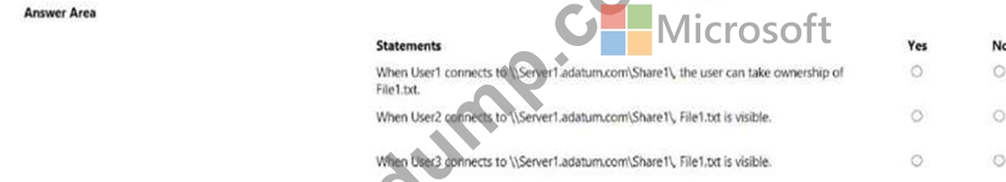 Share1에 대한 공유 권한은 공유 권한 전시회에 표시된 대로 구성됩니다. (공유 권한 탭을 클릭합니다.) 공유! Filel.txt라는 파일이 포함되어 있습니다. Filel.txt에 대한 고급 보안 설정은 파일 권한 전시에 표시된 대로 구성됩니다. (파일 권한 탭을 클릭합니다.) 다음 각 명령문에 대해 명령문이 참이면 예를 선택하십시오. 그렇지 않으면 아니요를 선택합니다.