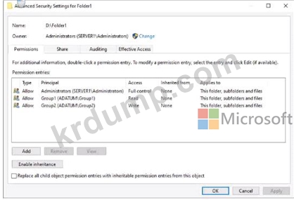 Server1에는 D:\Folder1이라는 폴더가 있습니다. 폴더 1에 대한 고급 보안 설정은 권한 전시에 표시된 대로 구성됩니다. (권한 실험실을 클릭합니다.)