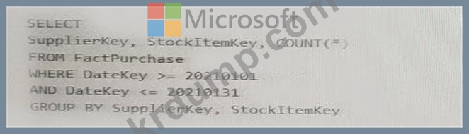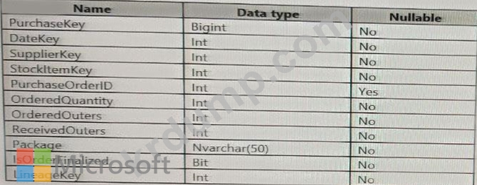 Azure Synaps Analytics 전용 SQL 풀에서 FactPurchase라는 팩트 테이블을 디자인하고 있습니다. 이 테이블에는 소매점에 대한 공급업체의 구매가 포함됩니다. FactPurchase에는 다음 열이 포함됩니다.