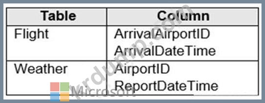 Flight 및 Weather라는 두 개의 팩트 테이블이 있습니다. 테이블을 대상으로 하는 쿼리는 다음 열 간의 조인을 기반으로 합니다.
