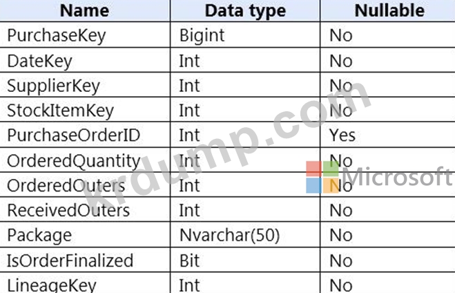 Azure Synapse Analytics 전용 SQL 풀에서 FactPurchase라는 팩트 테이블을 디자인하고 있습니다. 이 테이블에는 소매점에 대한 공급업체의 구매가 포함됩니다. FactPurchase에는 다음 열이 포함됩니다.