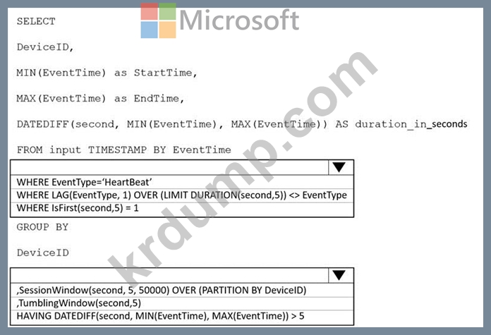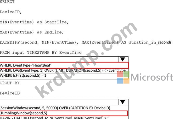 Stream Analytics SQL 쿼리를 어떻게 완료해야 합니까? 답변하려면 답변에서 적절한 옵션을 선택하십시오.