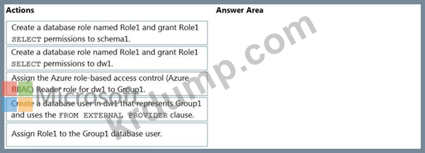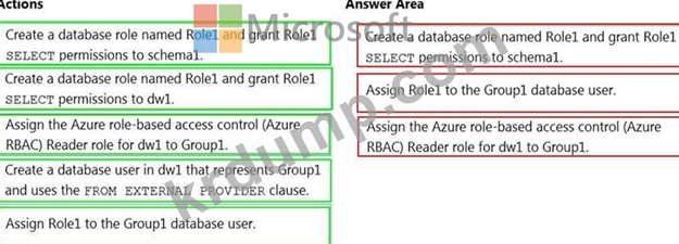 Group1이라는 보안 그룹이 포함된 Azure AD(Azure Active Directory) 테넌트가 있습니다. schema1이라는 스키마가 포함된 dw1이라는 Azure Synapse Analytics 전용 SQL 풀이 있습니다.