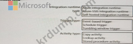 SQL 서버에서 Azure Data Lake Storage로 일일 인벤토리 데이터를 가져오기 위해 어떤 Azure Data Factory 구성 요소를 함께 사용하는 것이 좋습니까? 응답하려면 응답 영역에서 적절한 옵션을 선택하십시오.
