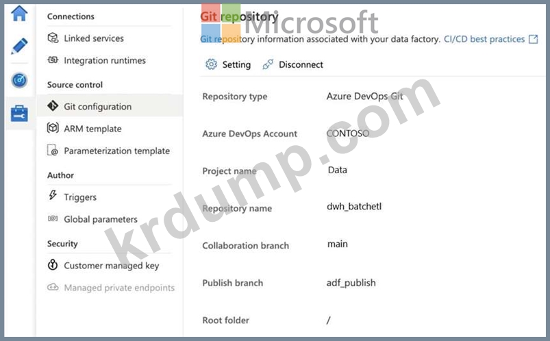 다음 전시와 같이 Azure Data Factory 인스턴스에 대한 버전 제어를 구성합니다.