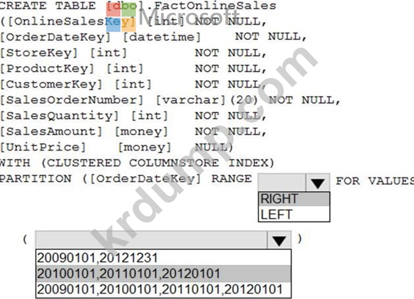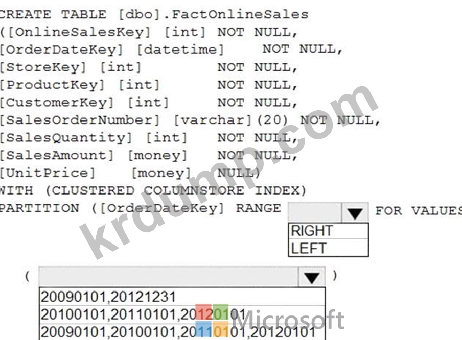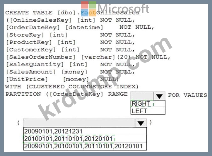 Azure Synapse Analytics에 FactOnlineSales라는 테이블이 포함된 엔터프라이즈 데이터 웨어하우스가 있습니다. 이 테이블에는 2009년 초부터 2012년 말까지의 데이터가 포함되어 있습니다.