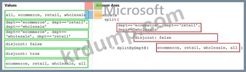 Data Factory 데이터 흐름 스크립트를 어떻게 완료해야 하나요? 응답하려면 적절한 값을 올바른 대상으로 드래그하십시오. 각 값은 한 번, 두 번 이상 또는 전혀 사용되지 않을 수 있습니다. 콘텐츠를 보려면 창 사이의 분할 막대를 드래그하거나 스크롤해야 할 수 있습니다.